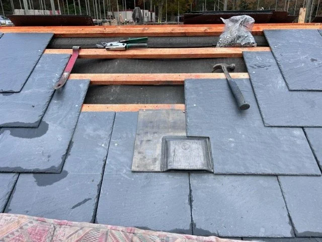Close mitred slate roof with lead hip soakers